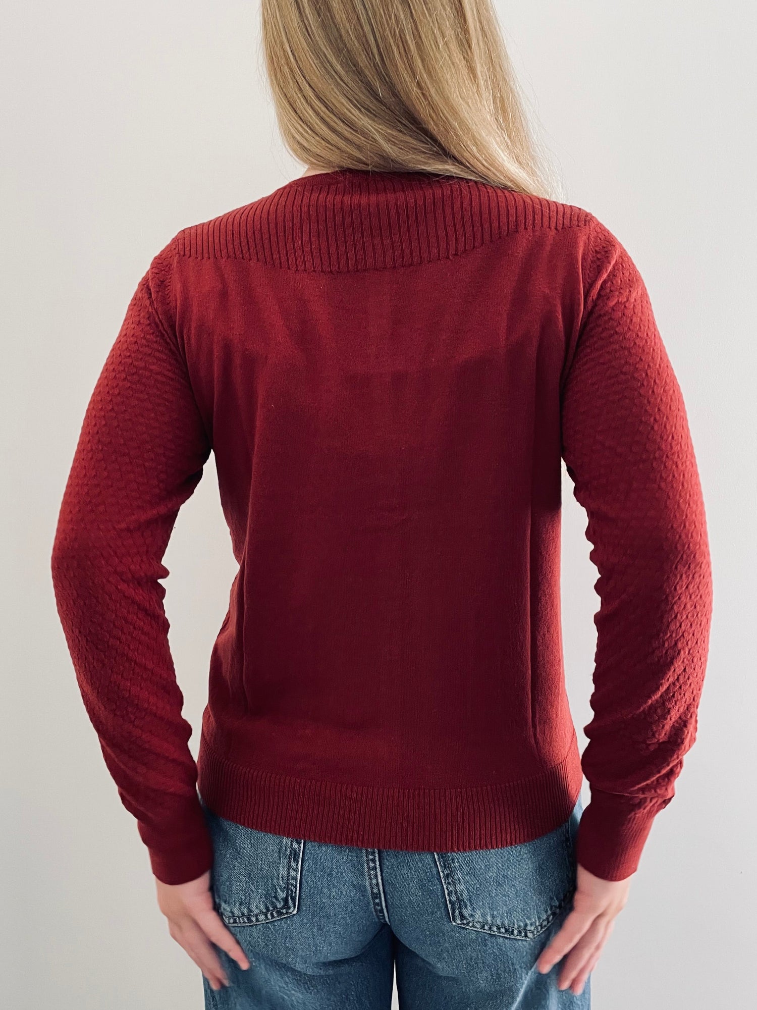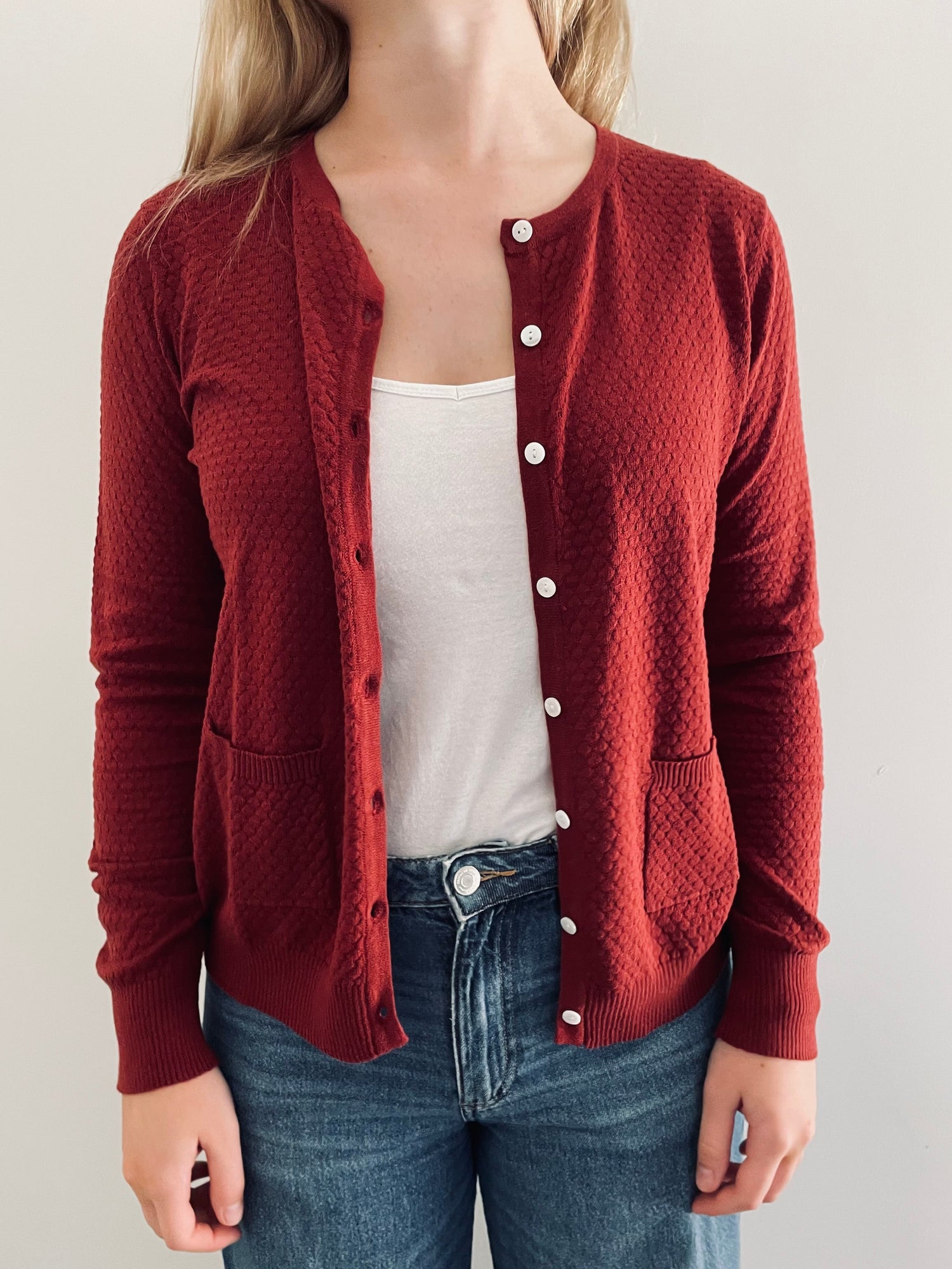 Our classic long sleeve, cotton cardigan in a modern earthy rusty red, with long sleeve, round neck, little front pockets, rib at back shoulder yoke & shell buttons.